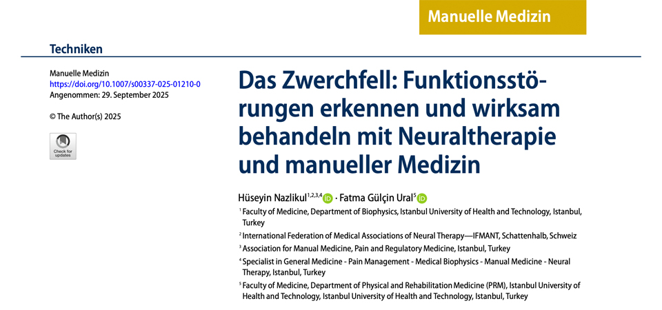 Das Zwerchfell, ein zentraler Atemmuskel, spielt eine essenzielle Rolle bei der Atmung, der Stabilität des Rumpfes und der Regulation des intraabdominellen Drucks. Es nimmt eine zentrale Rolle in zahlreichen physiologischen Prozessen ein und beeinflusst sowohl die respiratorische als auch die systemische Gesundheit. Der vorliegende Artikel beleuchtet die klinische Vielfalt von Zwerchfelldysfunktionen und analysiert deren vielschichtige Ursachen, die von neurologischen Störungen bis hin zu mechanischen Einschränkungen reichen. Zwerchfelldysfunktionen stellen ein häufig übersehenes medizinisches Problem dar, das sich in Symptomen wie Dyspnoe, Schlafstörungen, chronischer Erschöpfung, gastroösophagealem Reflux und sogar Herzinsuffizienz manifestieren kann. Die Ursachen solcher Dysfunktionen sind vielfältig und umfassen u. a. chronischen Stress, myofasziale Triggerpunkte, Narbengewebe sowie mechanische Traumata, die zu Irritationen oder Funktionsstörungen des N. phrenicus führen können. Eine Beeinträchtigung des N. phrenicus resultiert nicht nur in einer eingeschränkten Atembewegung, sondern auch in einer gestörten Regulation des autonomen Nervensystems und der Organfunktionen. Die Kombination aus Neuraltherapie und manueller Medizin hat sich als ein vielversprechender therapeutischer Ansatz erwiesen. Gezielte Injektionen an myofaszialen Triggerpunkten und segmentale Therapien können Verklebungen lösen und die Zwerchfellfunktion signifikant verbessern. Die manuelle Diagnostik ermöglicht eine präzise Identifikation segmentaler Dysfunktionen und faszialer Restriktionen. Der integrative Charakter dieses Ansatzes besteht in der Berücksichtigung sowohl lokaler biomechanischer Dysfunktionen als auch der regulatorischen Potenziale des autonomen Nervensystems. Die Kombination der Neuraltherapie und manuellen Medizin eröffnet neue Perspektiven für die Behandlung dieser häufig fehldiagnostizierten und unterbewerteten Krankheitsbilder.